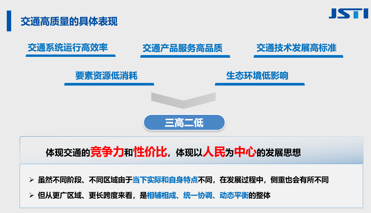 课题分析了交通高质量发展的内涵是要以绿色经济的投入,为社会公众提供更安全、更便捷、更高效的交通运输产品和服务,强调运输产品和服务的性价比与竞争力,体现以人民为中心的发展思想。