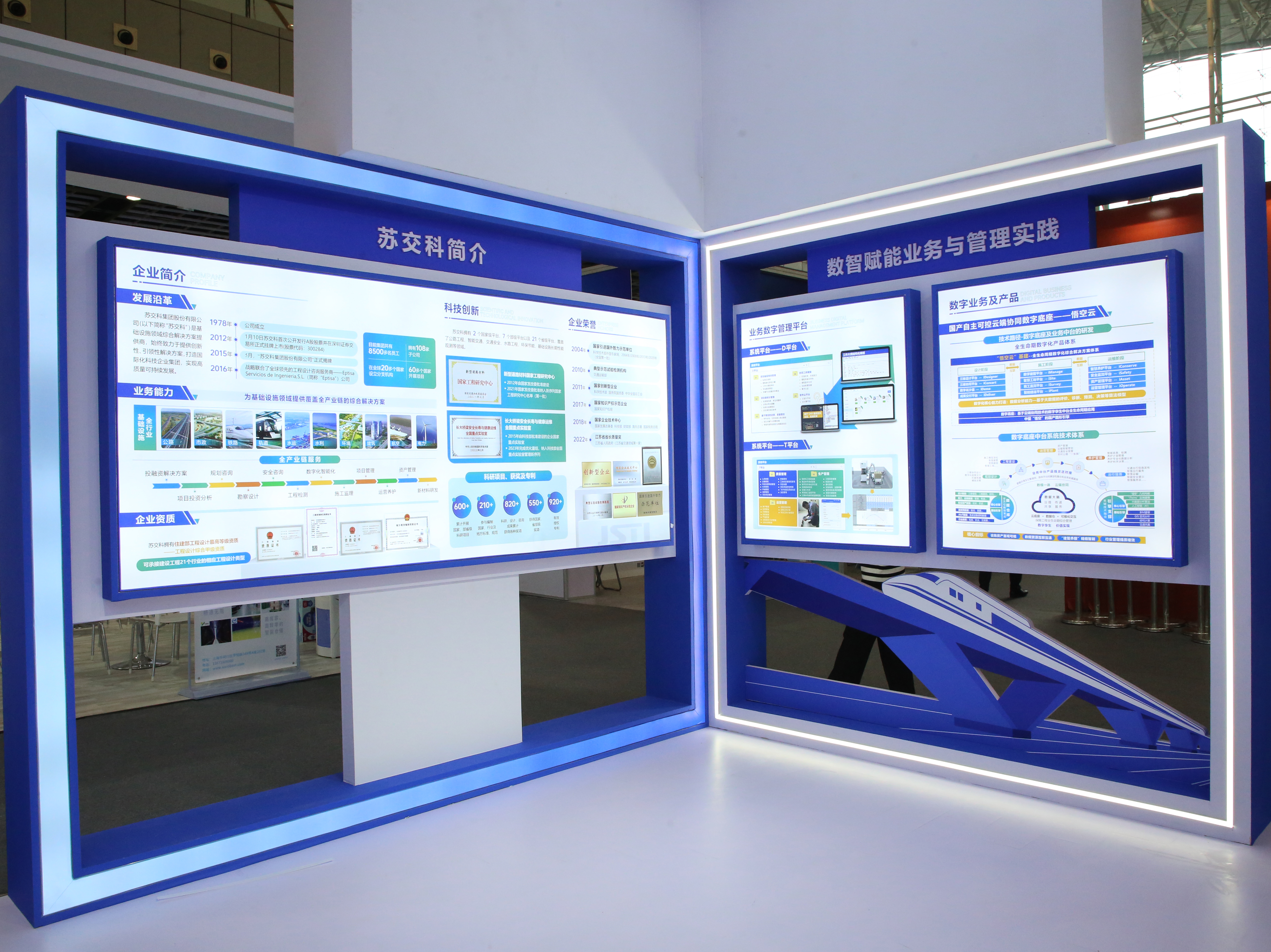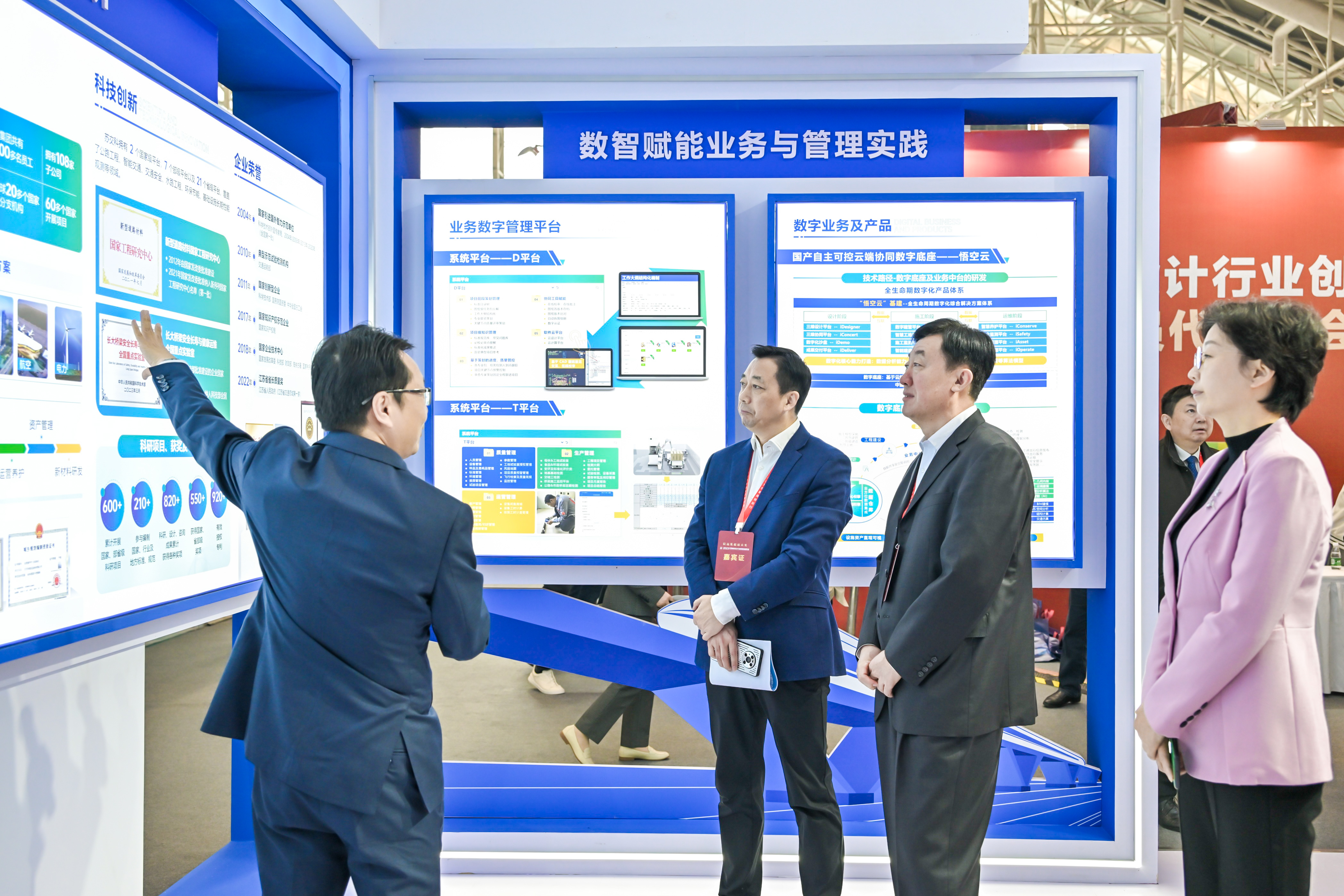 本次集团重点展出在岩土工程勘察,高速公路和城市快速路设计,水利基建和轨道交通设计等数十个具有技术特点的国内外典型勘察设计项目,以及业务数字管理平台、国产自主可控云端协同数字底座——悟空云、基于数实融合的交通基础设施数字化应用、黄茅海跨海通道工程施工阶段BIM技术应用、城市生命线平台等数字化项目。