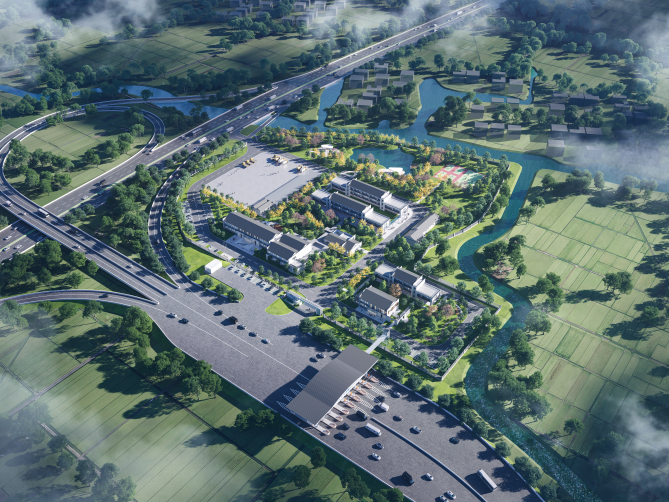 践行零碳服务设施理念---项目总图定位遵循办公、生活、交通动线布设,功能复合融通。利用建筑设施屋面与互通匝道边坡布设光伏发电系统,做到服务区与部分收费站能源自给。车库、仓库设计应用装配式技术,引导施工驻地标准化建设,提升施工质量效能。通过生成式AI技术,提升项目成果编制效率,降低成本。项目建设应用智慧办公照明、智慧光能灯、智能VRV系统,做到软硬件结合,提升使用舒适性的同时节能降碳。结合客户行为习惯,针对不同功能空间开展精细化布置,打造温馨化、人文化的办公环境。灵活预留扩建平台,应对未来日益增长的功能需求。
