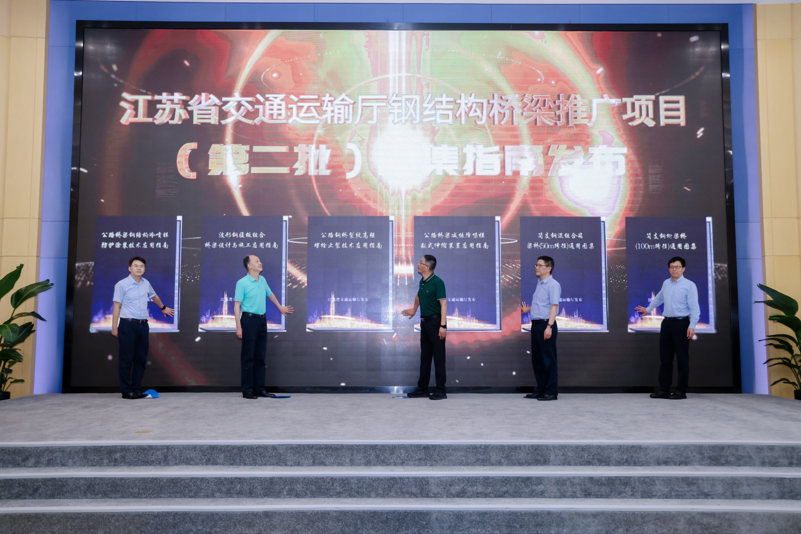 江苏省交通运输厅副厅长丁峰、二级巡视员黄岩,江苏省钢结构桥梁产业联盟理事长钟建驰及编制单位负责人共同启动《指南》发布,厅综计处、科技处、建管处,省交通综合执法局,厅公路中心、港航中心,省交建局,各市交通运输局代表,省重点建设项目指挥部以及联盟理事和会员单位代表共同见证。集团交通科学研究院院长杨扬、副总裁(桥梁检测)徐剑等相关负责人出席发布仪式。