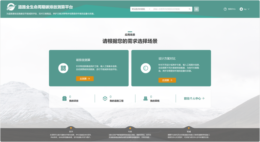 平台分为碳排放测算与设计方案对比两大模块。碳排放测算模块可针对特定新建或养护工程,基于用户提供的工程基本信息,自动测算碳排放数据,进行节能减排效益评估;设计方案对比模块可针对不同设计或养护方案,进行数据测算并横向对比分析。
