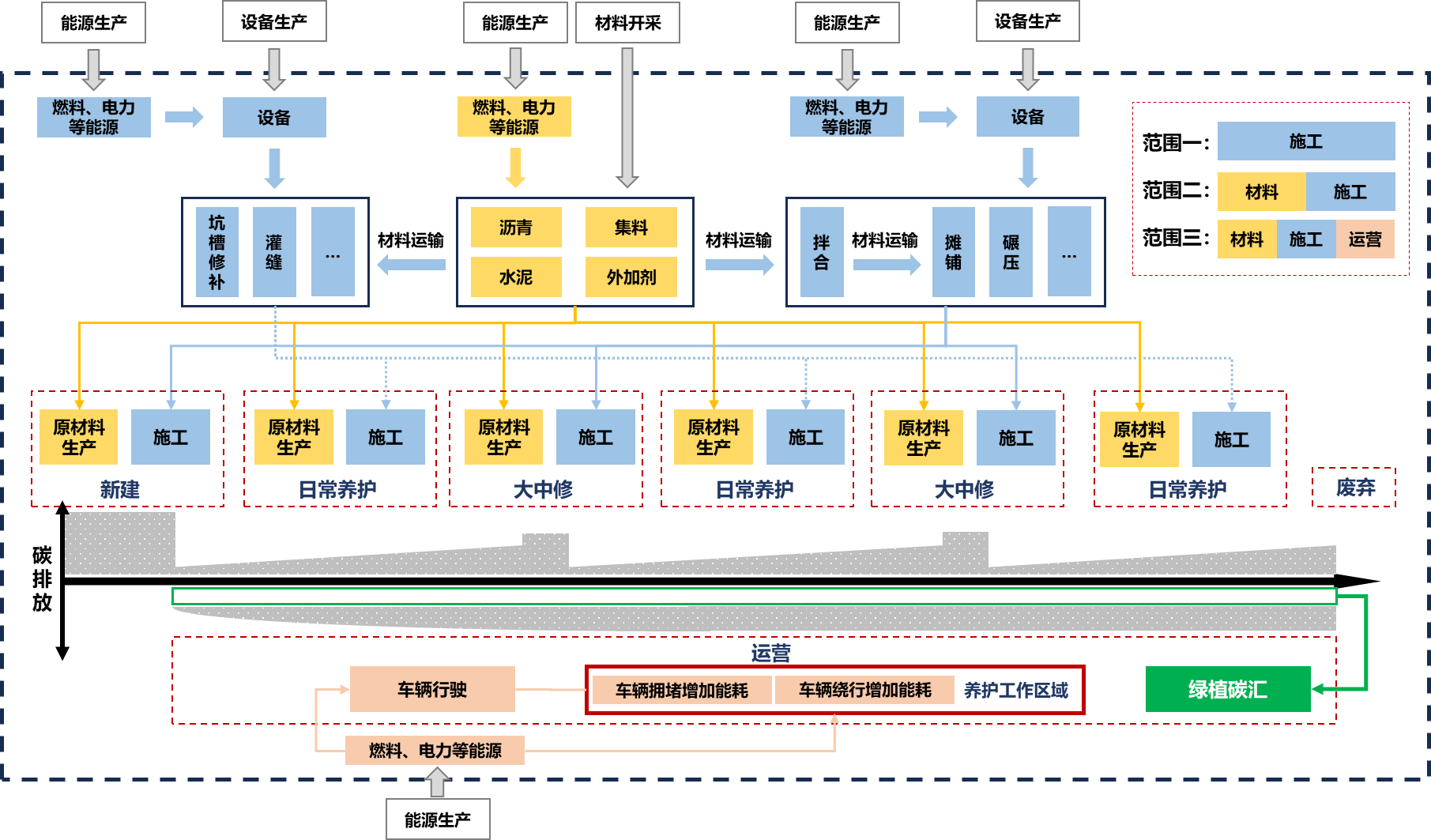 研发团队对路面全生命周期碳排放测算边界进行详细规定,目前测算软件已实现原材料阶段、施工阶段碳排放数据测算,后期将逐步增加完善,实现运营阶段碳排放测算。