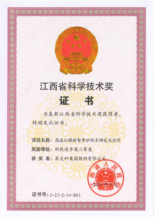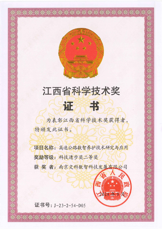 近日,江西省人民政府发布《江西省人民政府关于2023年度江西省科学技术奖励的决定》,共148项科技成果获奖,其中省自然科学奖44项、省技术发明奖9项、省科学技术进步奖95项。其中,集团以及旗下子公司南京交科数智科技发展有限公司(以下简称“交科数智”)参与完成的《高速公路数智养护技术研究与应用》项目,荣获“2023年江西省科技进步奖二等奖”。