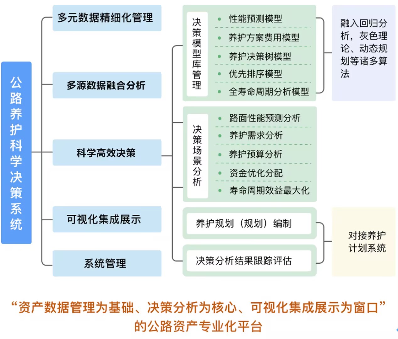 自主研发的公路养护科学决策系统(模块)iDecision 3.0,立足公路管理部门实际需求和相关行业政策要求,以解决“在维持公路资产处于良好运营状态的条件下,做好科学养护,提高资金效益”为目标导向,可满足路桥等资产养护科学决策分析需求,产品既可作为独立化子系统运行,也支持单独模块(算法包)与管理部门现有综合养护管理系统对接,实现与现有计划业务系统的无缝贴合,为养护管理业务数字化转型赋能。